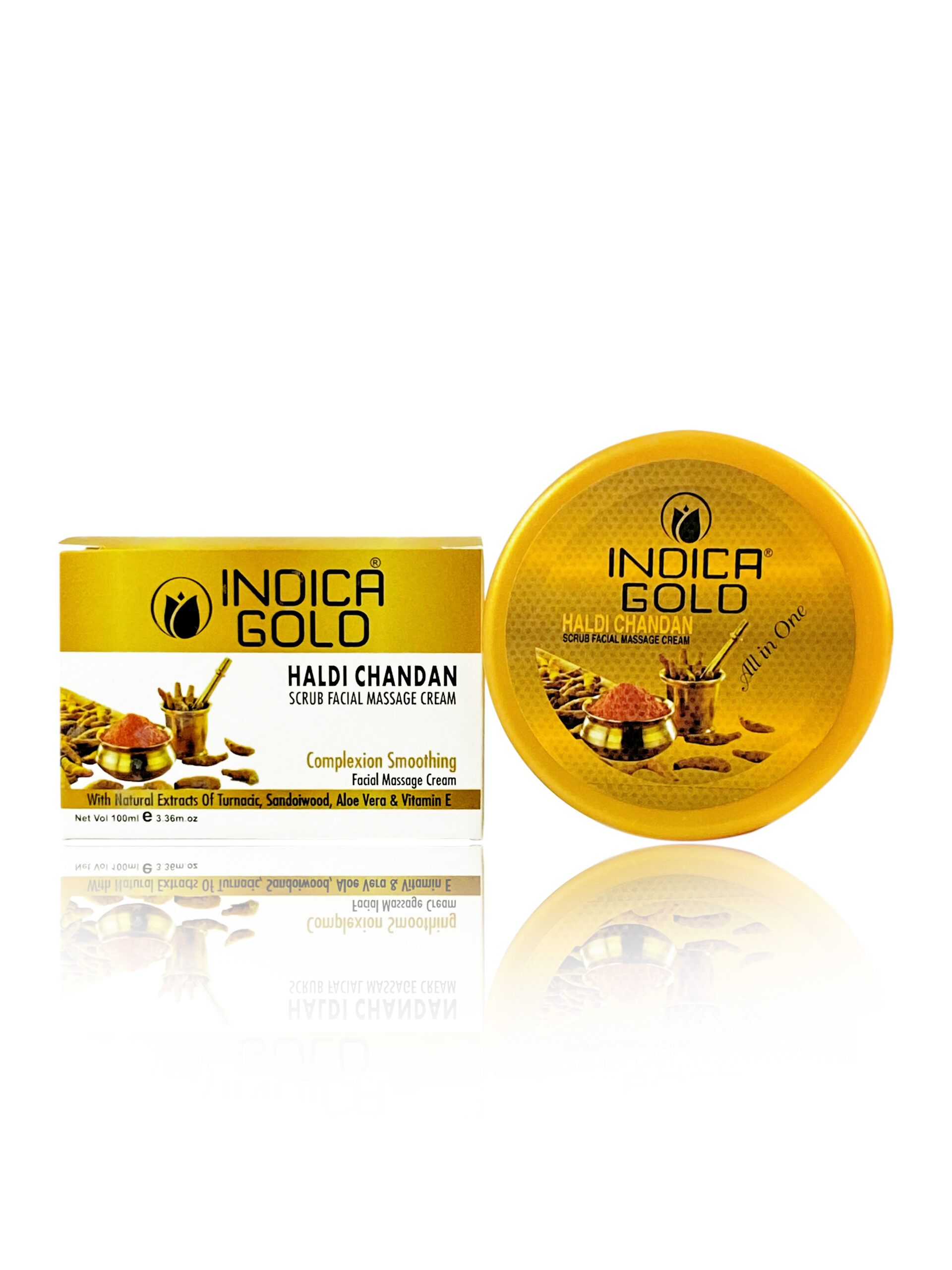 “Reveal golden, glowing skin with the Indica Gold Haldi Chandan Scrub Facial Massage Cream! Infused with turmeric (haldi) and sandalwood (chandan), this luxurious formula deeply exfoliates, nourishes, and brightens your skin for a radiant, youthful glow.”